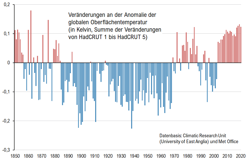 Die Änderungen am HadCRUT-Datensatz wurden mit Versionsmummern dokumentiert: Von HadCRUT 1 – letztes Update 01/2003 – bis HadCRUT 5 – letztes Update vor diesem Artikel 05/2025. Aber auch unterhalb der Hauptversionsnummern gibt es Änderungen. Die Einzelfälle der Änderungen sind wahrscheinlich nicht mehr nachvollziehbar.